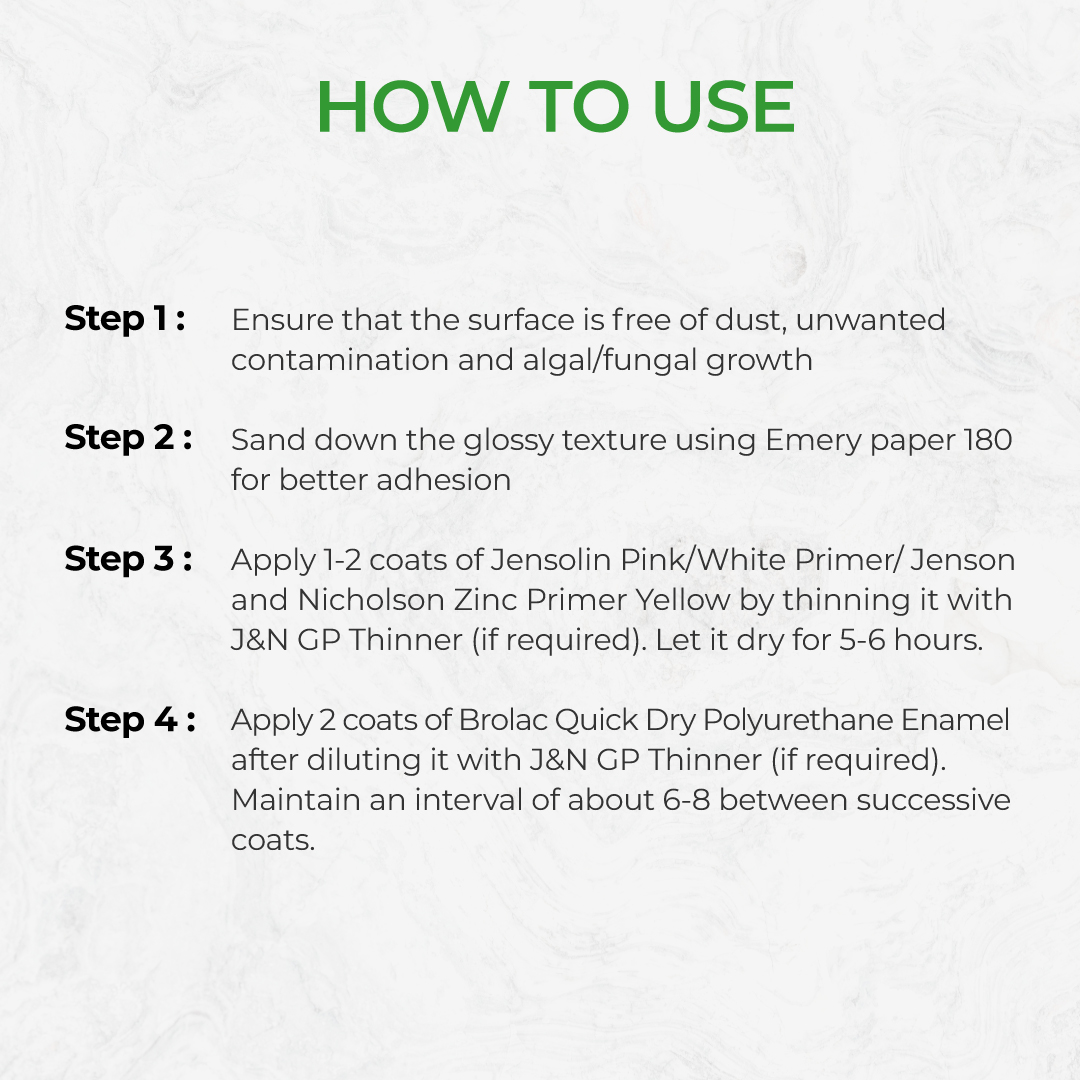 PRIMING Ferrous Metal Surface: Apply 1-2 coats of J&N Superior Red Oxide Primer on the metal surface by thinning (If necessary). Allow drying for 8-10 hrs after each coat. Non-Ferrous Metal Surface: Apply 1-2 coats of J&N Zinc Primer Yellow on the metal surface, by thinning it with J&N GP Thinner, if necessary. Let it dry for 5-6 hrs. Wooden Surface: Apply first coat of Jensolin Pink/White Primer on the wooden surface by thinning with J&N GP thinner (if required). Let it dry for 8-10 hrs. Use suitable putty to fill minor cracks, dents or holes. After drying, use Emery Paper 180 to sand the surface. Apply another coat of J&N Pink/White Primer. Allow it to dry for 8-10 hrs. Masonry Surface: Apply first coat of Jensolin Pink/White Primer on the surface by thinning with J&N GP thinner (if necessary). Let it dry for 8-10 hrs.